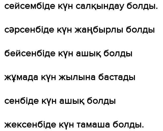 2. Өткен аптаның күн райын есіңе түсір. Суретті кесте жаса. Айтып бер. Үлгі: Дүйсенбіде күн бұлтты болады. пж помогите пожалуйста.