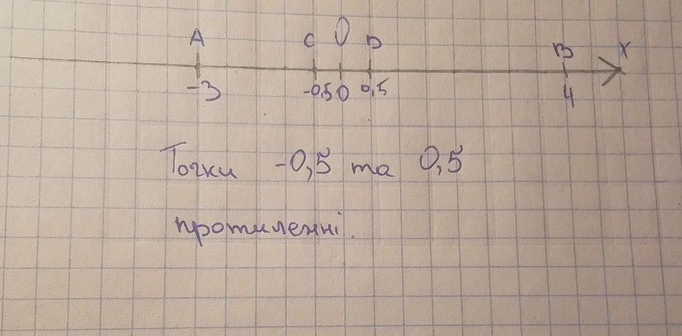 СРОЧНО ДАЮ 40!!Накресліть координатну пряму і позначте на ній точки А(-3), B(4), C(-0,5), Д(0,5). Які з позначених точок мають протилежні координати?
