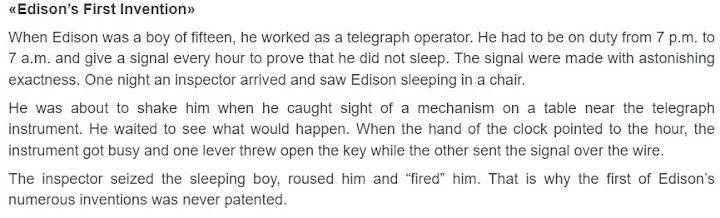 Когда Эдисон был пятнадцатилетним мальчиком, он работал телеграфистом. Он должен был дежурить с семи вечера до