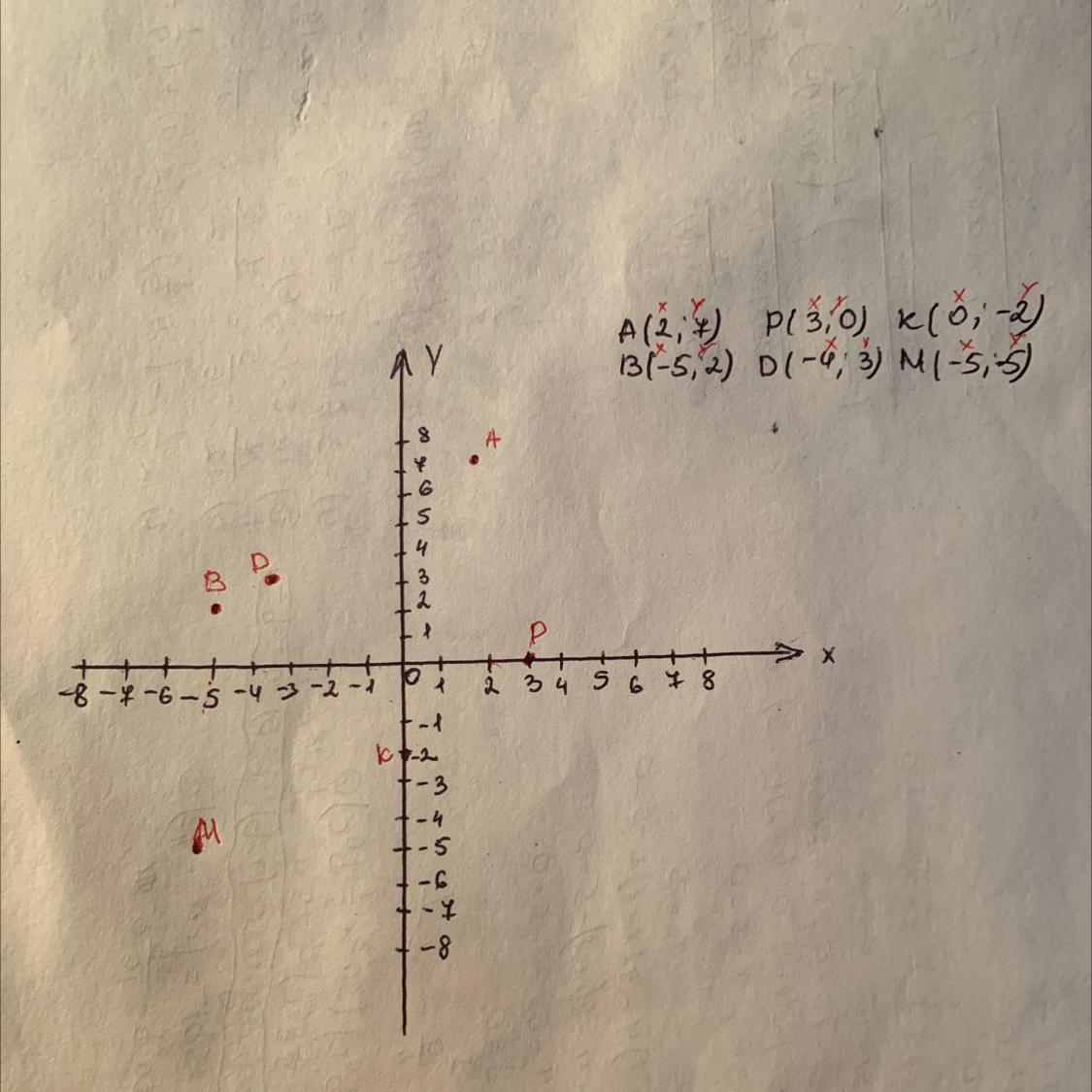 Накресли координатну площину. Постав на ній точки: А (2; 7), B (−5; −2), P (3; 0),