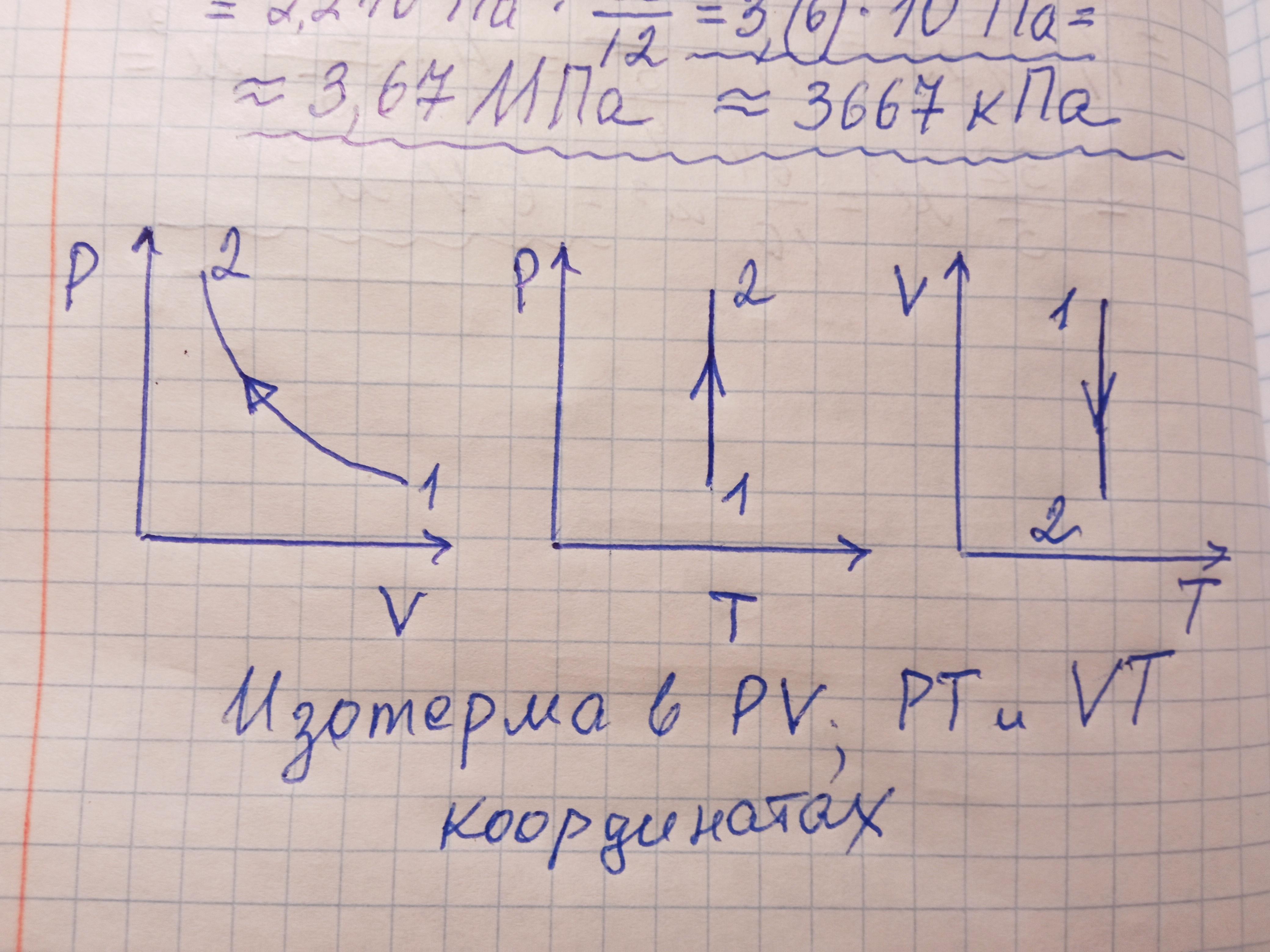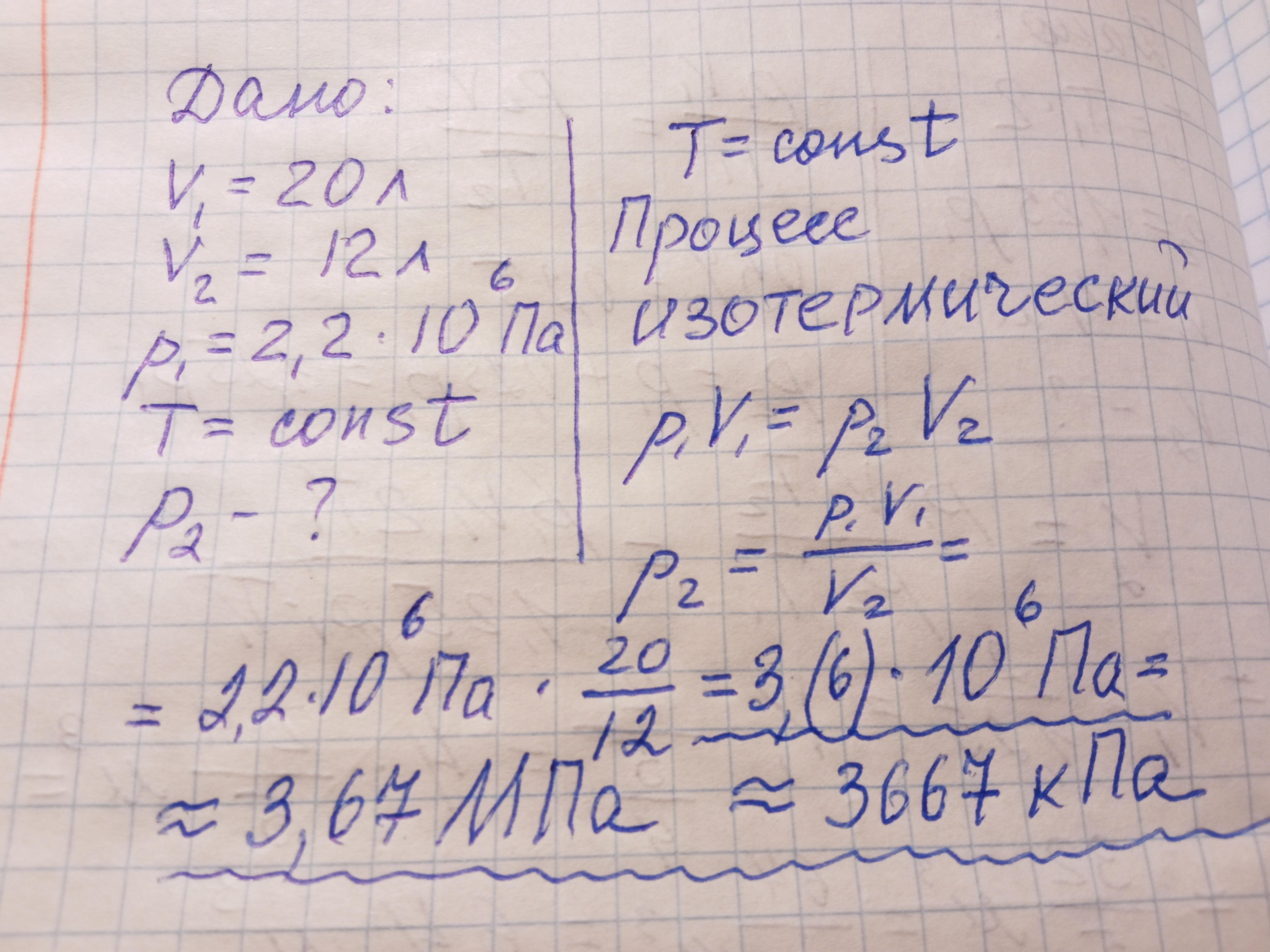 Під час стиснення газу об'єм зменшився від 20 до 12 л. Знайти, яким стане тиск газу, якщо початковий тиск дорівнював 2200 кПа. Температуру вважати постійною. (Назвати процес і зобразити графік процесу)