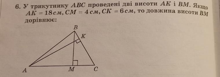 АК = 18см, СМ = 4 см, СК = 6см, то довжина висоти BM