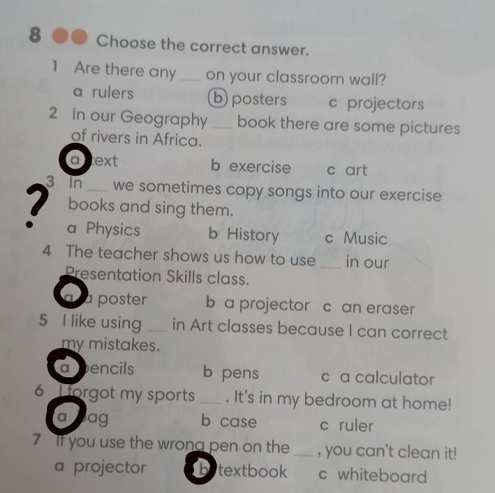 8 Choose the correct answer. 1 Are there any a rulers 2 In our Geography of rivers in Africa. 7 on your classroom wall? (b) posters c projectors book there are some pictures a text b exercise cart 3 In we sometimes copy songs into our exercise books and sing them. a Physics b History c Music 4 The teacher shows us how to use in our Presentation Skills class. a a poster b a projector can eraser 5 I like using in Art classes because I can correct my mistakes. a pencils b pens ca calculator 6 I forgot my sports. It's in my bedroom at home! a bag b case c ruler If you use the wrong pen on the a projector b textbook you can't clean it! c whiteboard 1