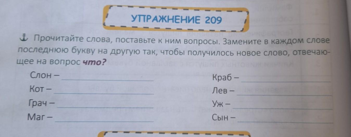 УПРАЖНЕНИЕ 209 Прочитайте слова, поставьте к ним вопросы. Замените в каждом слове последнюю букву на другую так, чтобы получилось новое слово, отвечаю- щее на вопрос что?