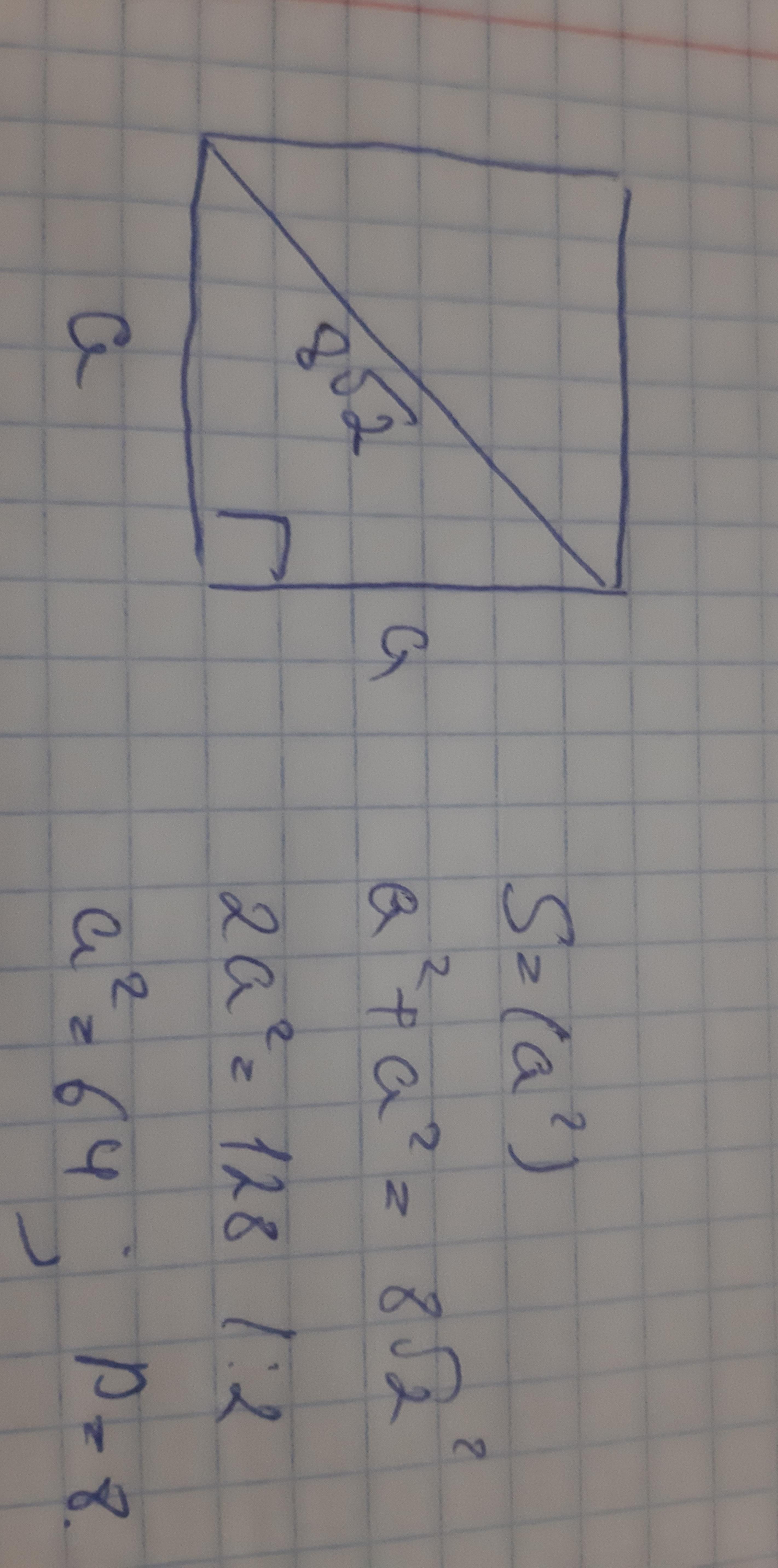 Вычислите периметр и площадь квадрата, если его диагональ равна 8√2 см.