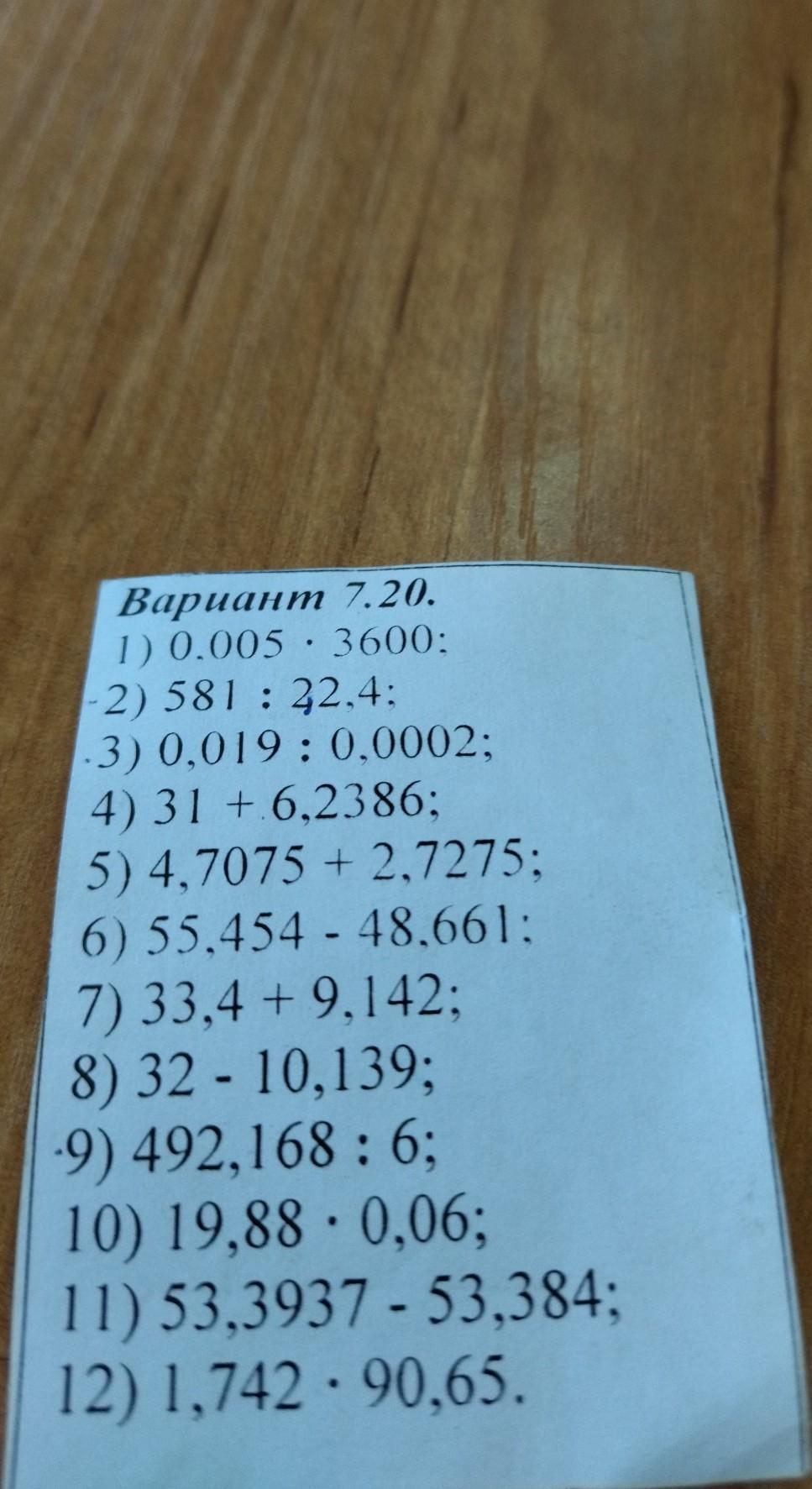 Вариант 7.20. 1) 0.005 3600: 2) 581 22,4; -3) 0,019: 0,0002; 4) 31 +6,2386; 5) 4,7075 +2,7275; 6) 55,454 - 48,661: 7) 33,4 +9,142; 8) 32-10,139; -9) 492.168: 6: 10) 19,88 0,06; 11) 53,3937 - 53,384; 12) 1,74290.65.