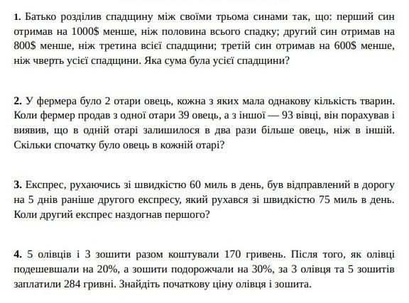 1. Батько роздiлив спадщину мiж своїми трьома синами так, що: перший син отримав на 1000$ менше, ніж половина всього спадку; другий син отримав на 800$ менше, ніж третина всієї спадщини; третій син отримав на 600$ менше, ніж чверть усієї спадщини. Яка сума була усієї спадщини? 2. у фермера було 2 отари овець, кожна з яких мала однакову кількість тварин. Коли фермер продав з одноï отари 39 овець, а з іншої - 93 вівці, він порахував і виявив, що в однiй отар залишилося в два рази більше овець, ніж в іншій. Скільки спочатку було овець в кожній отарi? 3. Експрес, рухаючись зі швидкістю 60 миль в день, був відправлений в дорогу на 5 днів раніше другого експресу, який рухався зі швидкістю 75 миль в день. Коли другий експрес наздогнав першого? 4. 5 олівців і 3 зошити разом коштували 170 гривень. Після того, як олівці подешевшали на 20%, а зошити подорожчали на 30%, за з олівця та 5 зошитів заплатили 284 гривні. Знайдіть початкову ціну олівця і зошита.