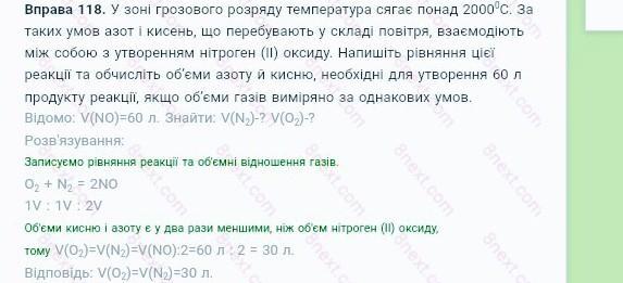 У зоні грозового розряду температура сягає понад 2000 С. За таких умов азот і кисень, що перебувають у складі повітря, взаємодіють між собою з утворенням нітроген(ІІ) оксиду. Напишіть рівняння цієї реакції та обчисліть об’єми азоту й кисню, необхідні для утворення 60 л продукту реакції, якщо об’єми газів виміряно за однакових умов.