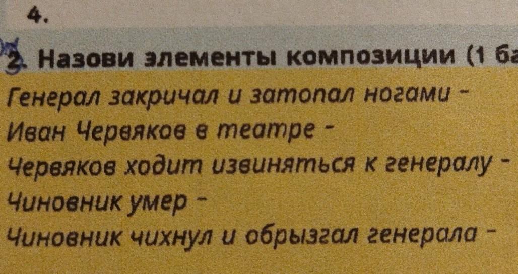 ФА. Назови элементы композиции (1 балл) Генерал закричал и затопал ногами - Иван Червяков в театре - Червяков ходим извиняться к генералу - Чиновник умер - Чиновник чихнул и обрызгал генерала -