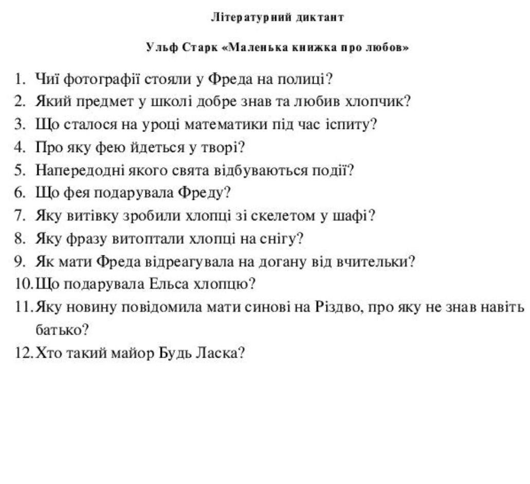 Літературний диктант Ульф Старк «Маленька книжка про любов» 1. Чиï фотографії стояли у Фреда на полиці? 2. Який предмет у школi добре знав та любив хлопчик? 3. Що сталося на уроці математики під час іспиту? 4. Про яку фею йдеться у творі? 5. Напередодні якого свята вiдбуваються події? 6. Що фея подарувала Фреду? 7. Яку витівку зробили хлопці зі скелетом у шафі? 8. Яку фразу витоптали на снігу? 9. Як мати Фреда відреагувала на догану вiд вчительки? 10. Що подарувала Ельса хлопцю? 11. Яку новину повідомила мати синові на Різдво, про яку не знав навiть батько? 12. Хто такий майор Будь ласка?