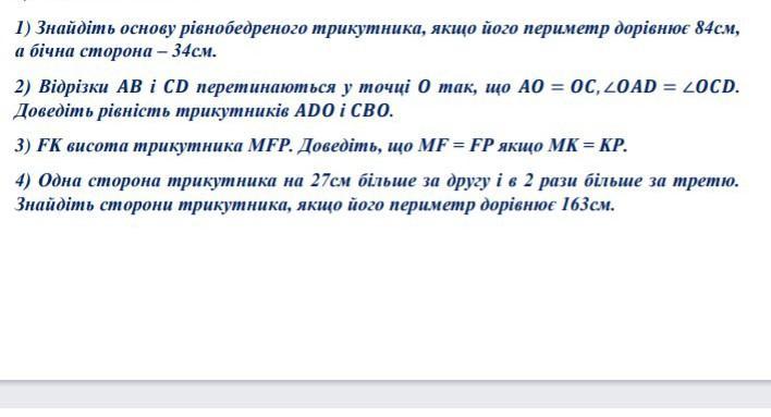 1) Знайдіть основу а бічна сторона - 34см. рівнобедреного трикутника, якщо його периметр дорівнює 84см, 2) Вiдрiзки AB i CD перетинаються у точці 0 так, що АО =0C, LOAD = LOCD. Доведіть рівність трикутників ADO i CBO. 3) FK висота трикутника MFP. Доведіть, що MF = FP якщо МК = КР. 4) Одна сторона трикутника на 27см більше за другу і в 2 рази більше за третю. Знайдіть сторони трикутника, якщо його периметр дорівнює 163cm.