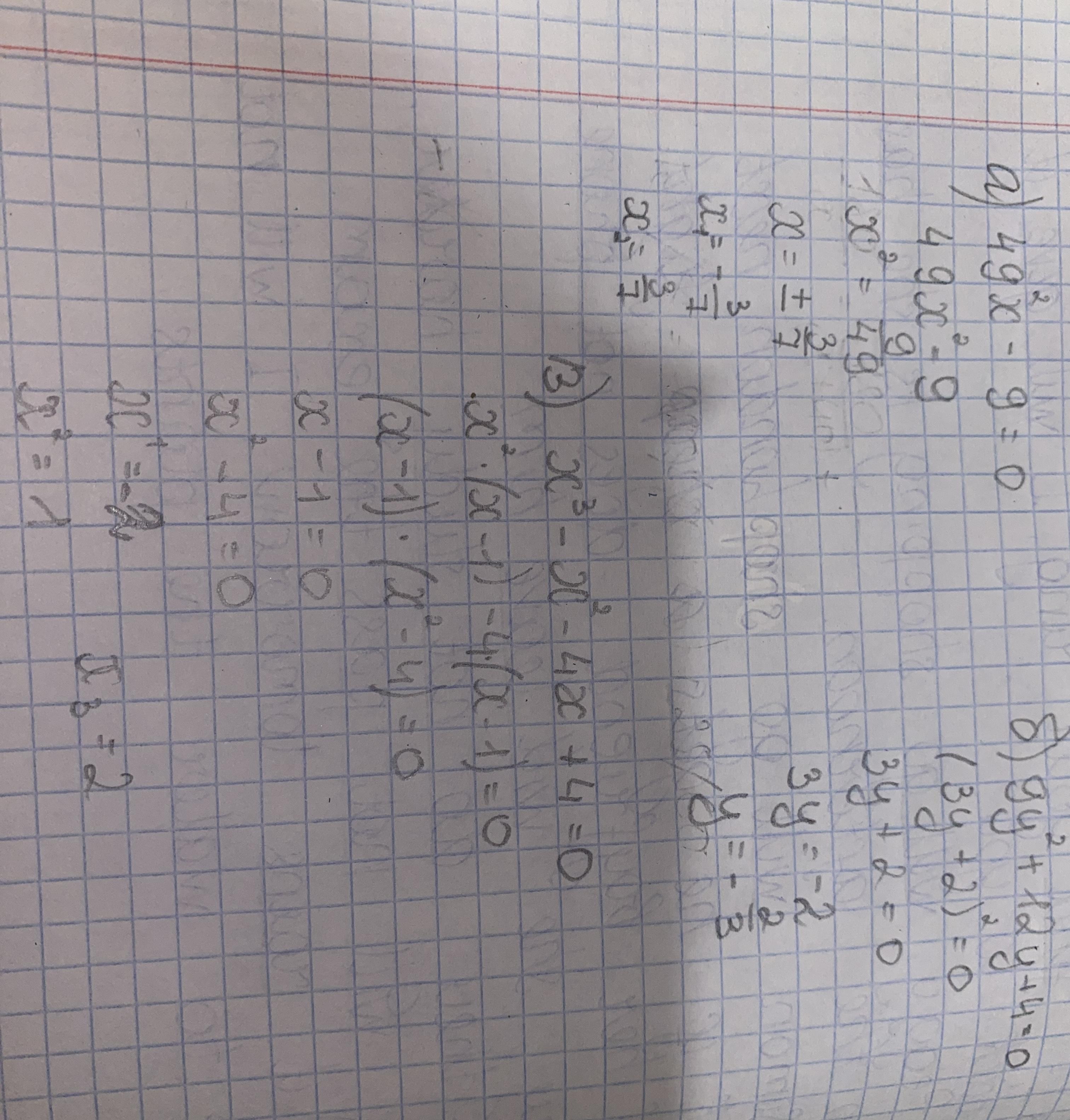5. Розв'яжи рiвняння. (2 бали) a) 49x² - 9 = 0; б) 9y² + 12y + 4 = 0; B) x³ - x² - 4x + 4 = 0