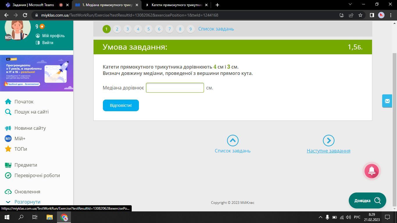 Визнач довжину медіани, проведеної з вершини прямого кута.