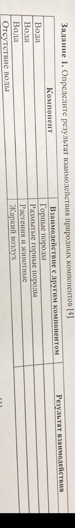 Задание 1. Определите результат взаимодействия природных компонентов [4] Вода Вода Вода Отсутствие воды Компонент Взаимодействие с другим компонентом Горные породы Размытые горные породы Растения Жаркий воздух и животные Результат взаимодействия СРОЧНО ДАЮ 100БАЛЛОВ