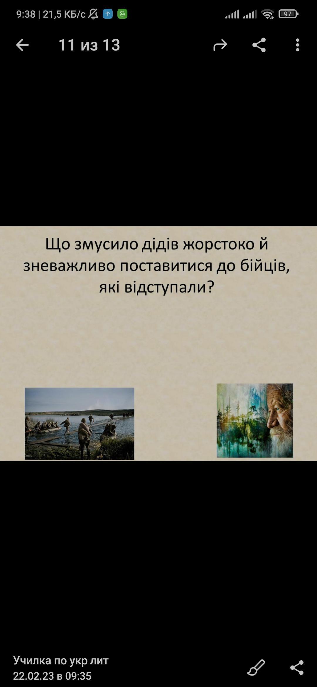 «Життя-бо ваше вже, а не моє. А тільки я так скажу вам на прощання. Не з тієї пляшки наливаете. П'ете ви, як бачу, жаль і скорботи. Марно п'єте. Це, хлопці, не ваші напої. Це напої бабські. А воїну треба напитися зараз кріпкої ненависті до