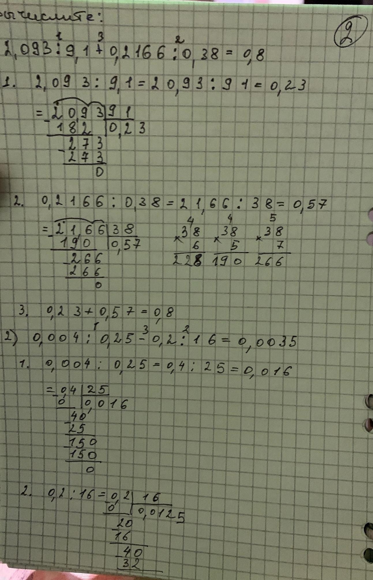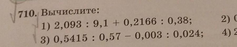 710. Вычислите: 1) 2,093: 9,1 +0,2166: 0,38; 3) 0,5415: 0,57 -0,003: 0,024; выражения 2) 0,004: 0,25 - 0,2:16; 4) 28,29: 12,3 +269,44:0,064.
