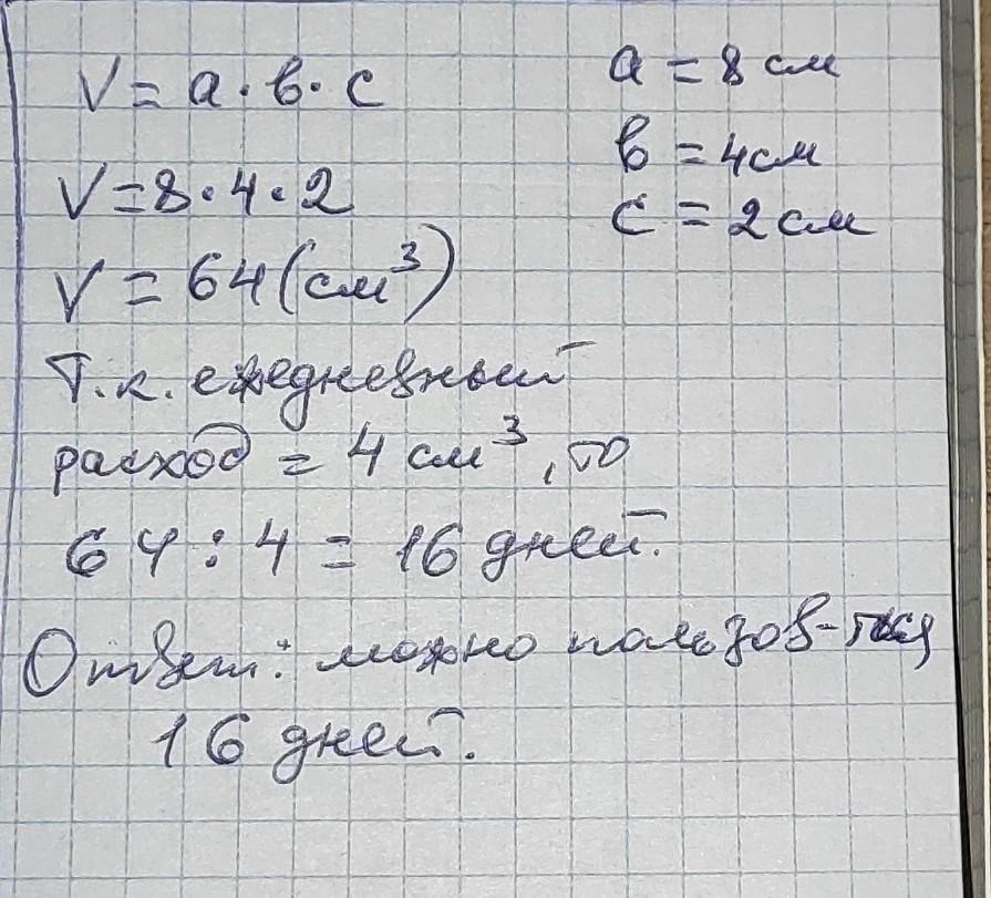 по математике задание очень очень трудно измерения куски мыла равны: 8см 4см и 2см его объем уменьшается 4 см сколько дней можно будет пользоваться этим куском мыла?