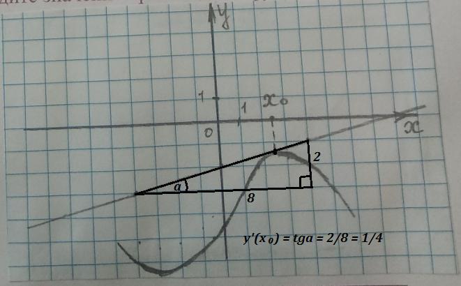 Значение производной в точке касания х₀ равно угловому коэффициенту касательной , который равен значению тангенса угла наклона касательной к положительному направлению оси ОХ .