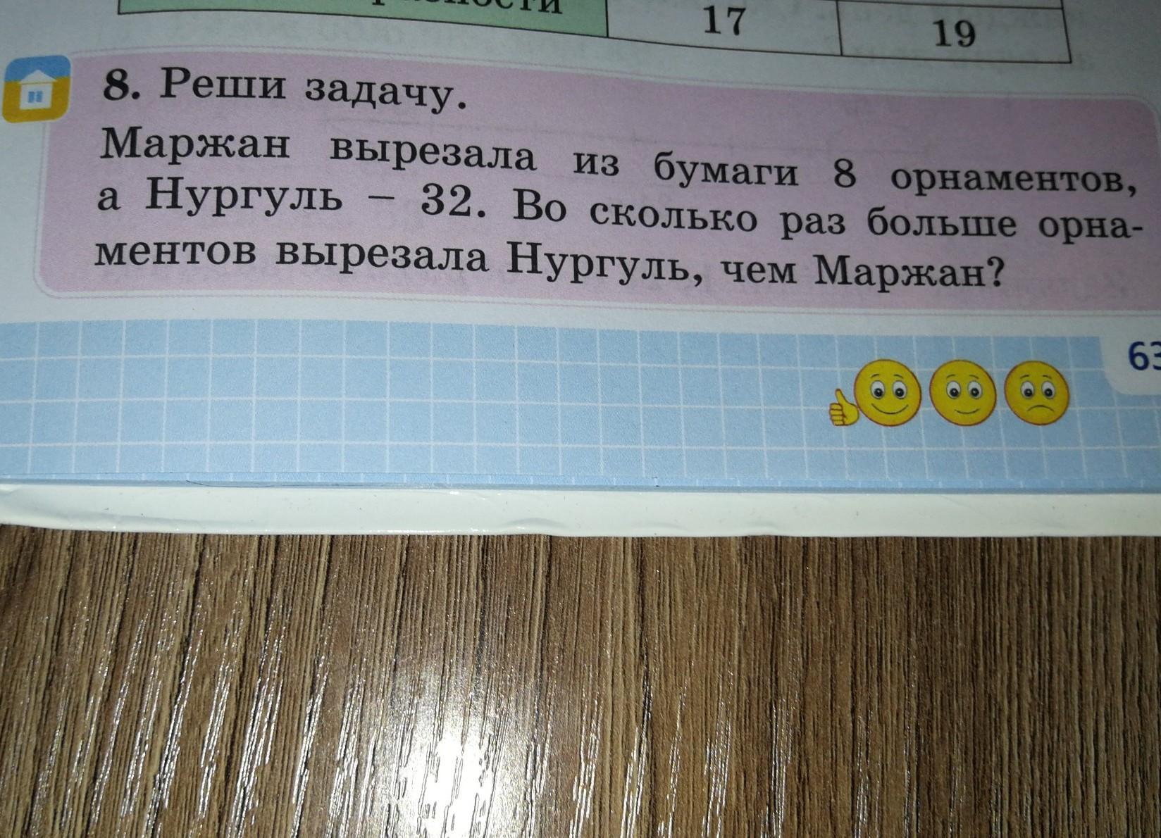 Маржан вырезала 8 орнаментов, Нургуль вырезала 32. Чтобы найти во сколько раз больше орнаментов вырезала Нургуль нужно разделить количество, вырезанное Нургуль на количество, вырезанное Маржан: