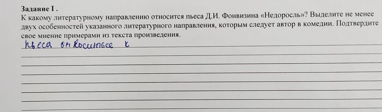 Задание I. К какому литературному направлению относится пьеса Д.И. Фонвизина «Недоросль»? Выделите не менее двух особенностей указанного литературного направления, которым следует автор в комедии. Подтвердите свое мнение примерами из текста произведения. Помогите пожалуйста
