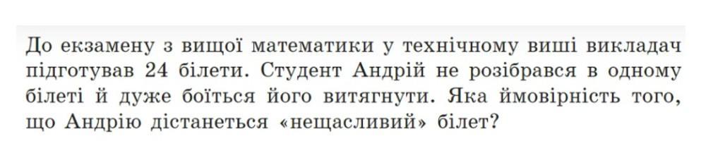До екзамену з вищої математики у технічному виші викладач підготував 24 бiлети. Студент Андрій не розібрався в одному білеті й дуже боїться його витягнути. Яка ймовірність того, що Андрію дістанеться «нещасливий» білет?