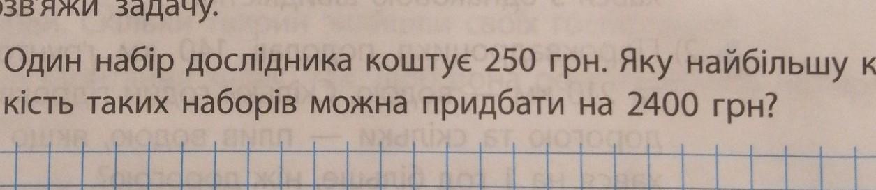 Один набір дослідника коштує 250 грн. Яку найбільшу кіль- кiсть таких наборів можна придбати на 2400 грн?