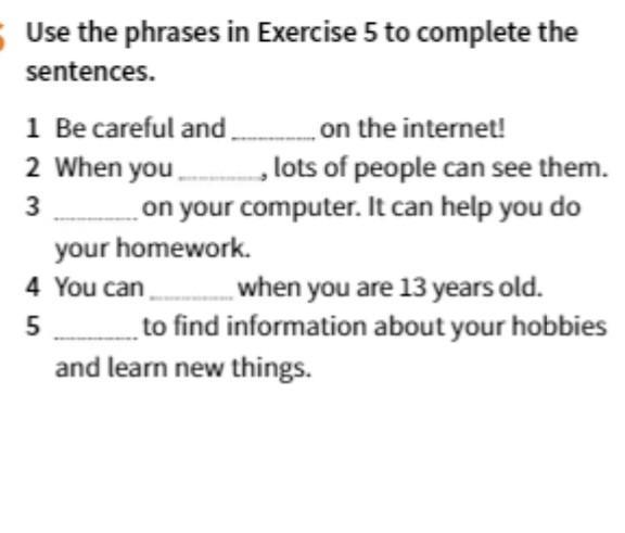 6 Use the phrases in Exercise 5 to complete the sentences. on the internet! lots of people can see them. on your computer. It can help you do 1 Be careful and 2 When you 3 your homework. 4 You can 5 when you are 13 years old. to find information about your hobbies and learn new things.