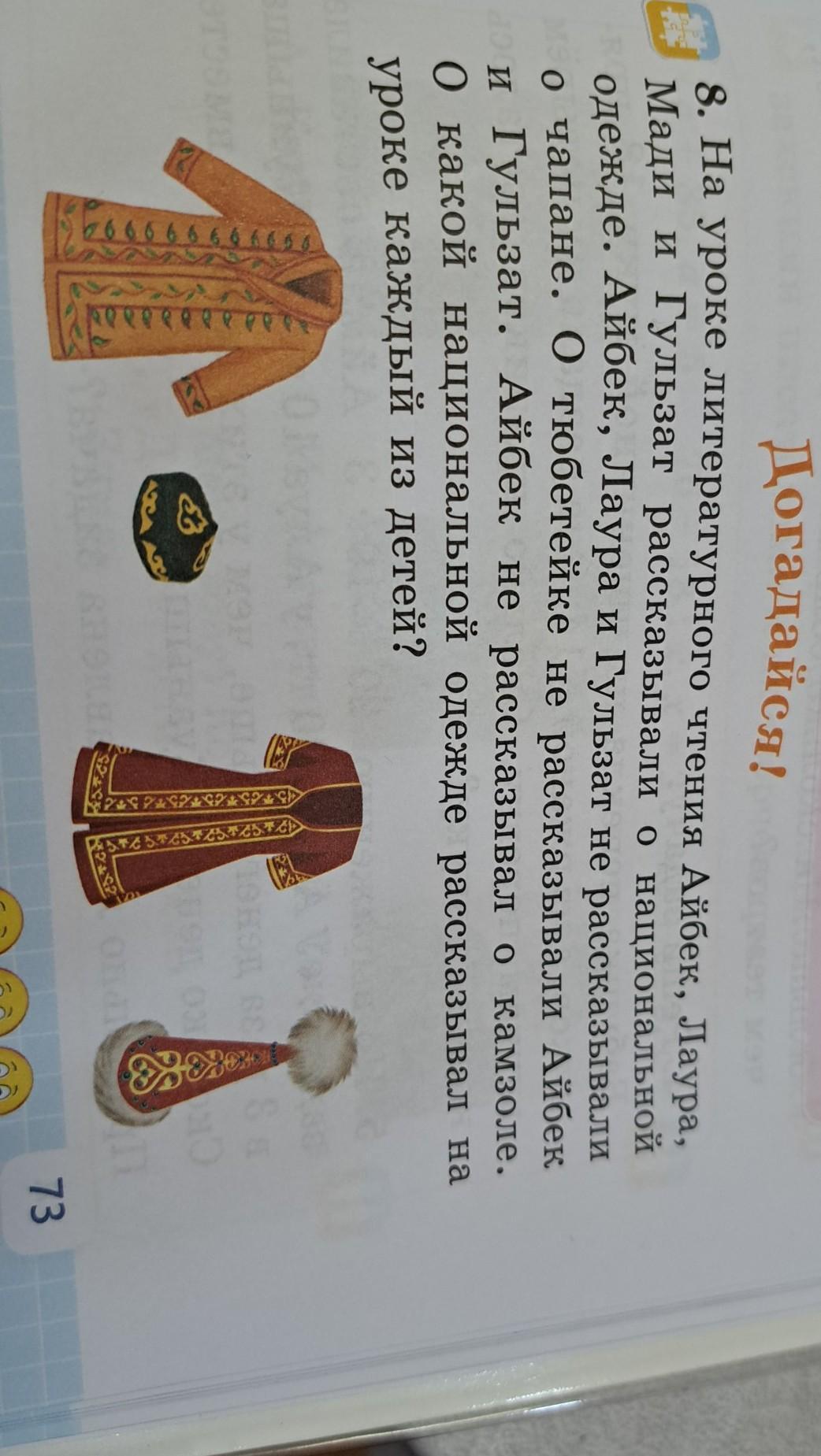 на уроке литературного чтения Айбек Лаура мадиуллизатор рассказывали национальной одежде Айбек Лаура и глюзат не рассказывали о чапане а тюбетейки не рассказывали Айбек и гульзат Айбек не рассказывал о кобзоле А какой национальной одежде рассказывал на уроке каждой из детей