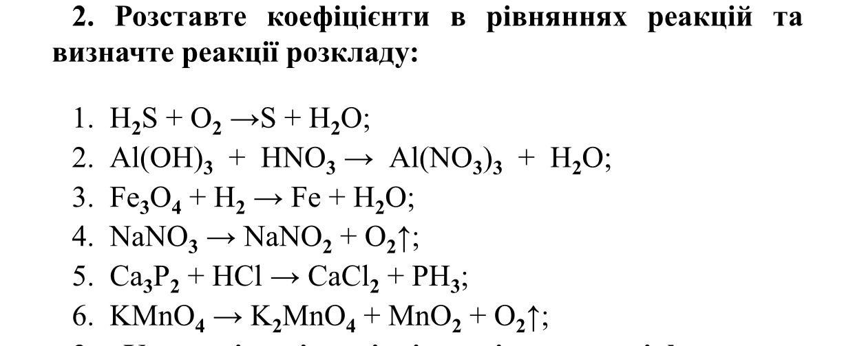 Розставте коефіцієнти в рівняннях реакцій та визначте реакції розкладу