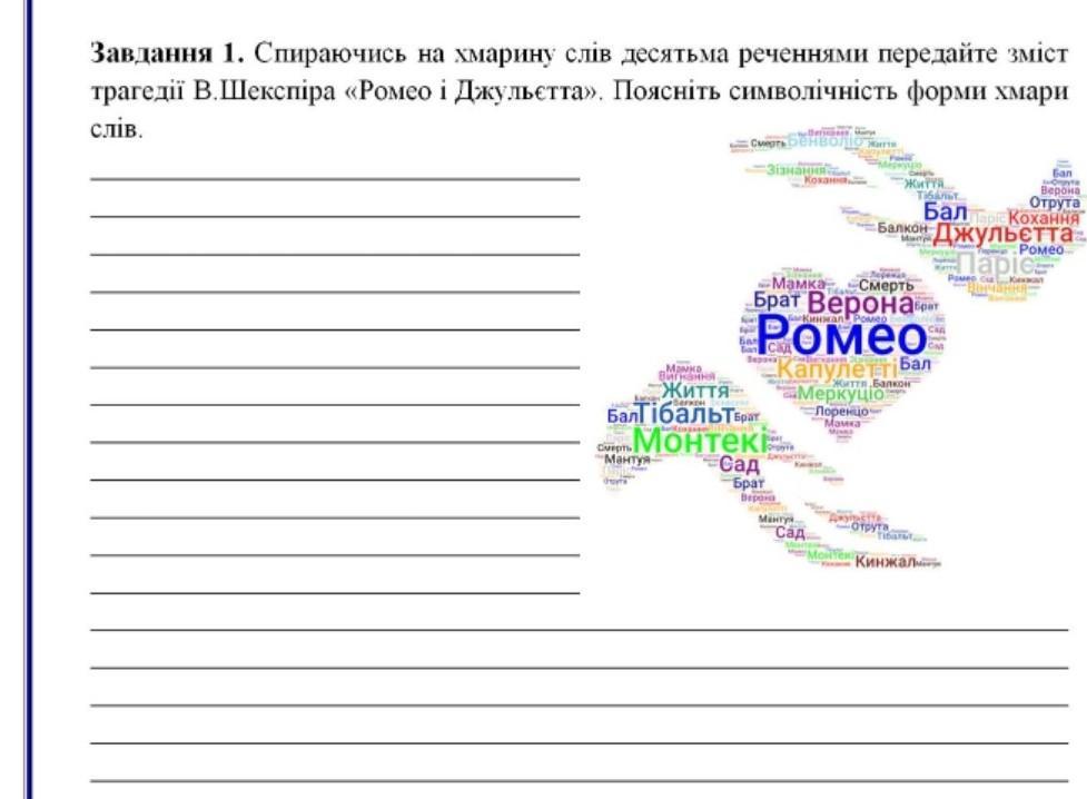 Спираючись на хмарину слів десятьма реченнями передайте зміст трагедії В.Шекспіра «Ромео і Джульєтта». Поясніть символічність форми хмари слів.