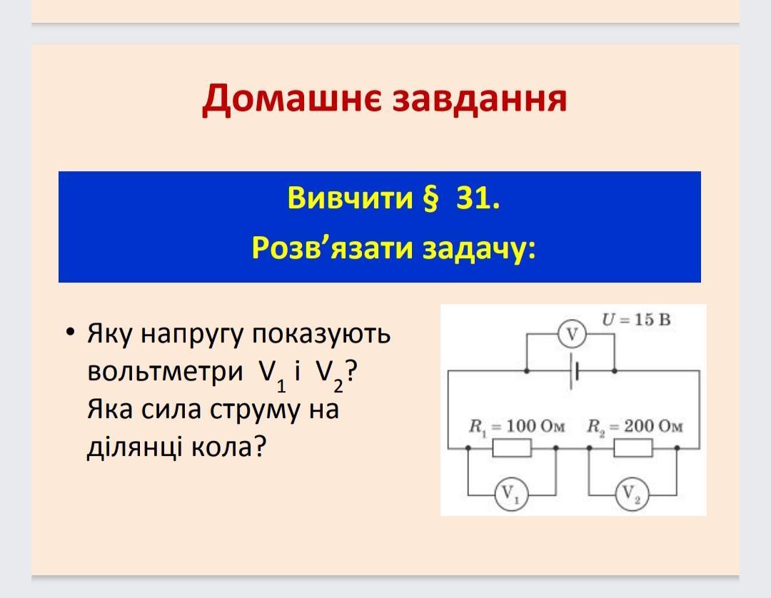 Яку напругу показують вольтметри V1 і V2? Яка сила струму на ділянці кола? (див. малюнок)