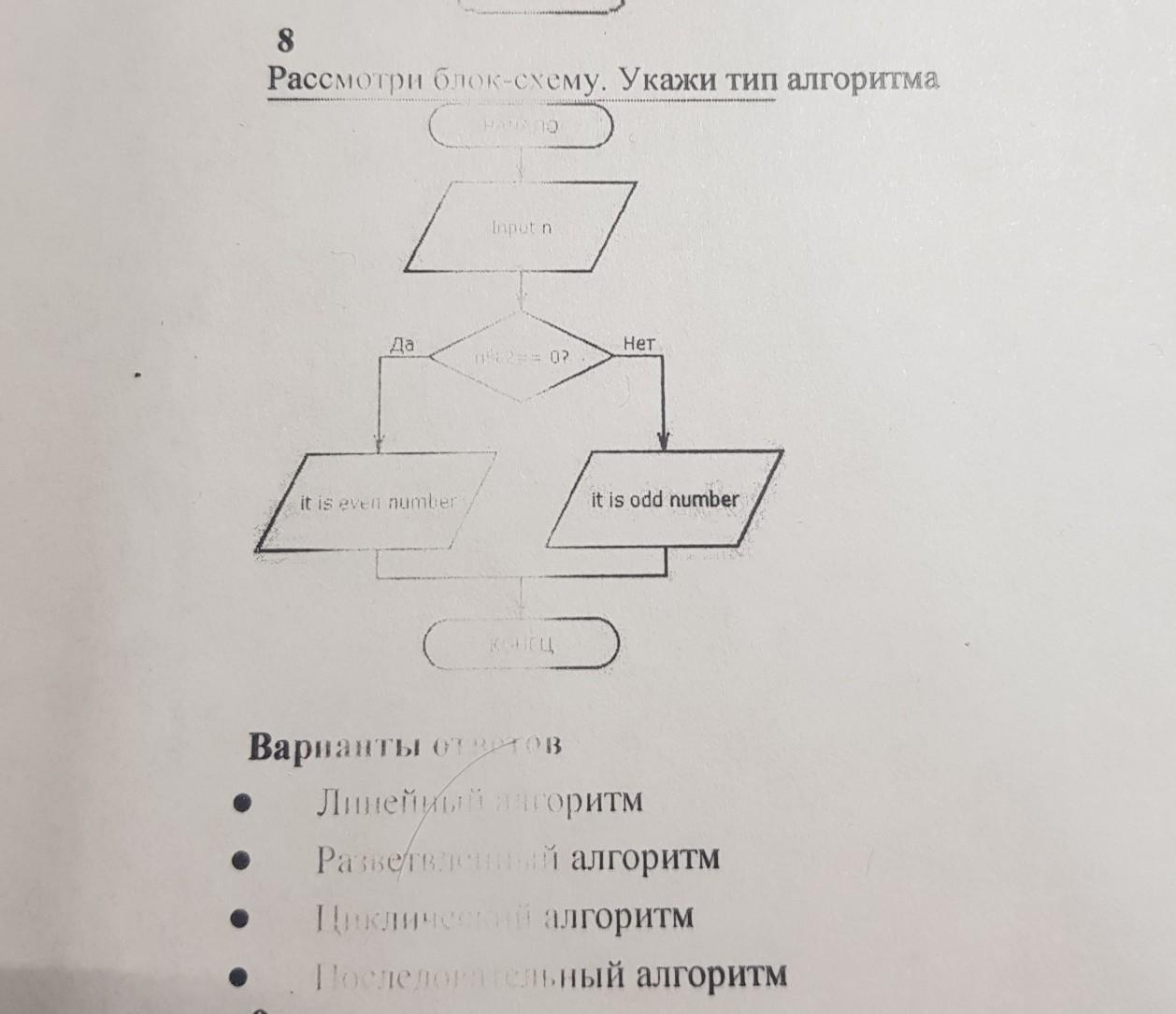 8 Рассмотри блок-схему. Укажи тип алгоритма НАЧАЛО Да it is even number Input n 0862== 0? НЕЦ Нет it is odd number Варианты ответов Линейный алгоритм Разветвленный алгоритм Циклический алгоритм Последовательный алгоритм