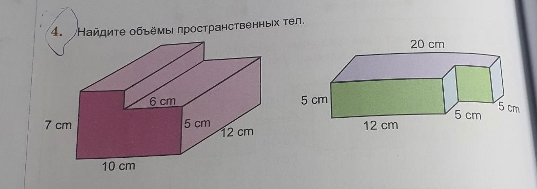 4. 7 cm Найдите объёмы пространственных тел. 10 cm 6 cm 5 cm 12 cm 5 cm 12 cm 20 cm 5 cm 5 cm
