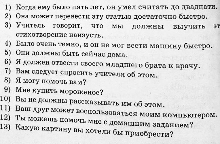 1) When he was five years old, he could count to twenty. 2) She can translate this article quickly enough. what WE should 3) The teacher says, memorize this poem. 4) It was very dark and he could not drive fast. 5) Now they should be at home. 6) I have to take my little brother to the doctor. 7) You should ask the teacher about it 8) Can I help you? 9) Is it worth buying ice cream? 10) You shouldn't tell them about it. 11) Your friend can use my computer. 12) Can you help me with my homework? 13) Which painting would you like to buy?