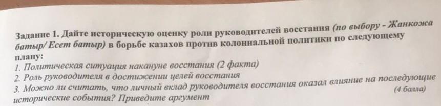 дайте историческую оценку роли руководителей восстания(на выбор: Жанкожа батыр/Есет батыр) в борьбе казахов против колониальной политики следуя плану: