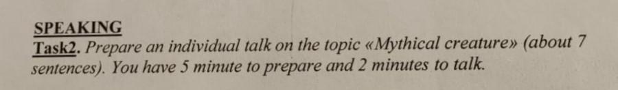 SPEAKING Task2. Prepare an individual talk on the topic «Mythical creature» (about 7 sentences). You have 5 minute to prepare and 2 minutes to talk.