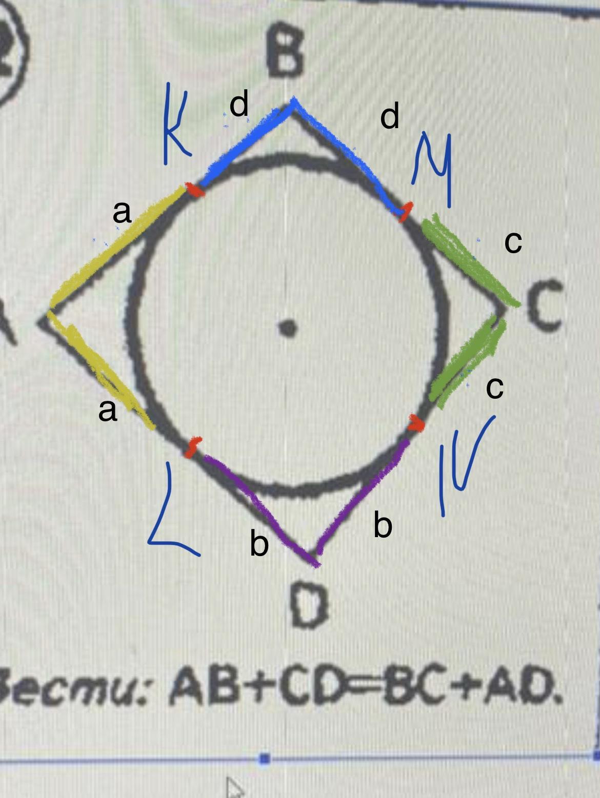 Пояснення:Позначимо точки дотику кола зі сторонами чотирикутника К, M, N, L.
