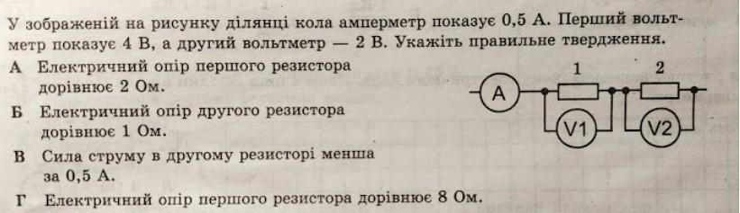 у зображеній на рисунку ділянці кола амперметр показує 0,5 А. перший вольтметр показує 4 В, а другий вольтметр - 2В. укажіть правильне твердження.