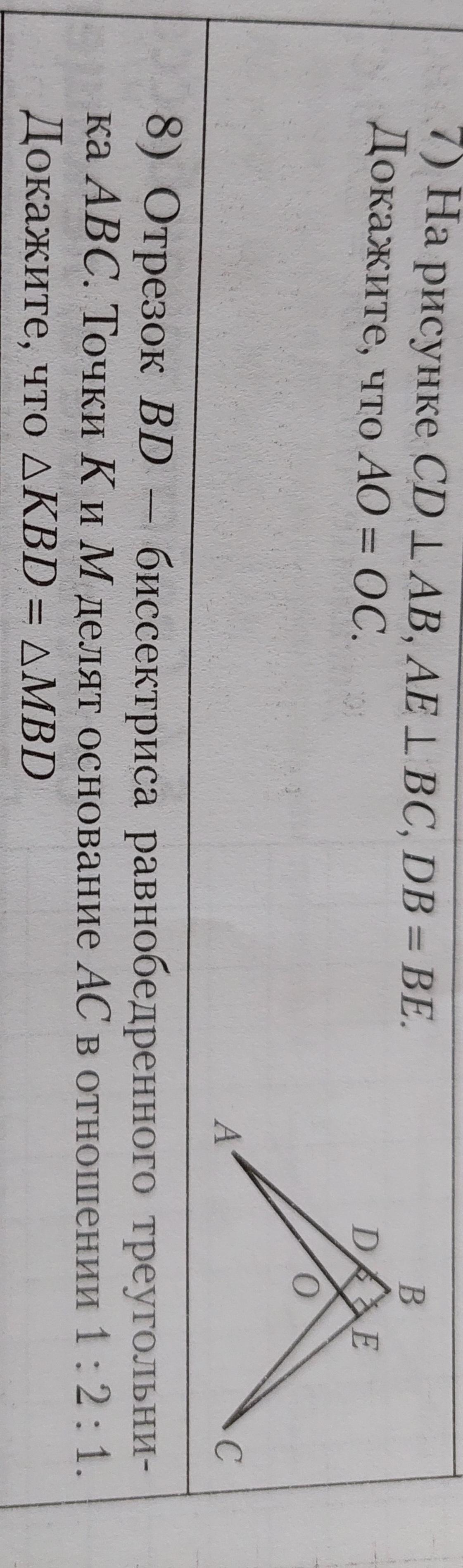 ∆АDO=∆СЕО - по катету и прилежащиму к нему углу , значит АО=ОС.