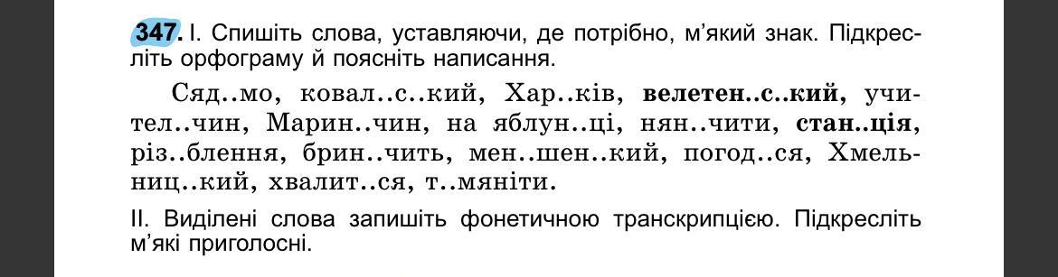 учительчин, Маринчин, на яблуньці, няньчити, станція, різьблення, бринчить, меншенький, погодься, Хмельницький, хвалиться, тьмяніти. II. Виділені слова запишіть фонетичною