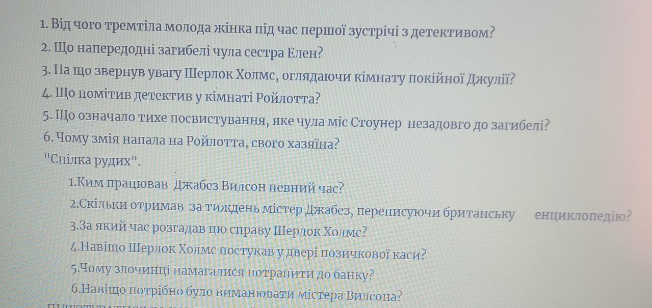 Будььласкааааааааа!!!! Терміново!!!!!!1. Від чого тремтіла молода жінка під час першої зустрічі з детективом? 2. Що напередодні загибелі чула сестра Елен? 3. На що звернув увагу Шерлок Холмс, оглядаючи кімнату покійної Джулії? 4. Що помітив детектив у кімнаті Ройлотта? 5. Що означало тихе посвистування, яке чула міс Стоунер незадовго до загибелі? 6. Чому змія напала на Ройлотта, свого хазяїна?