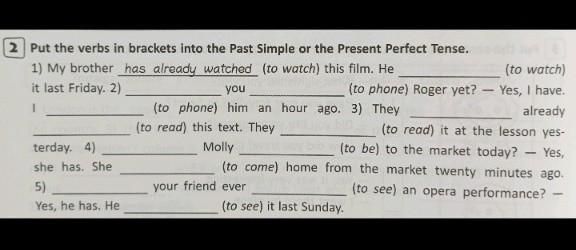 he watched it last friday. have you phoned roger yet? - yes, i have. i phoned him an hour ago. they have already read this text. they read it qtvthe lesson yesterday. has molly was to the market today? - yes, she has. she came home from market twenty minutes ago. has your friend ever seen an opera performance? - yes, he has. he seen it last sunday