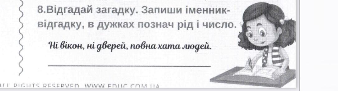 .Відгадай загадку. Запиши іменник-відгадку, в дужках познач рід і число.