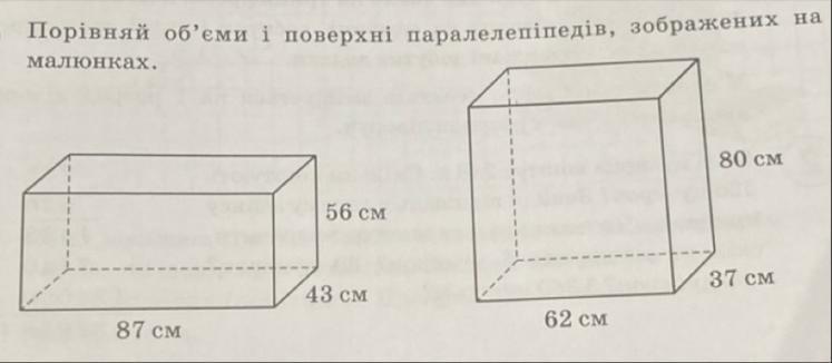 об'єм першого паралелепіпеда більше, а площа меньше ніж другого