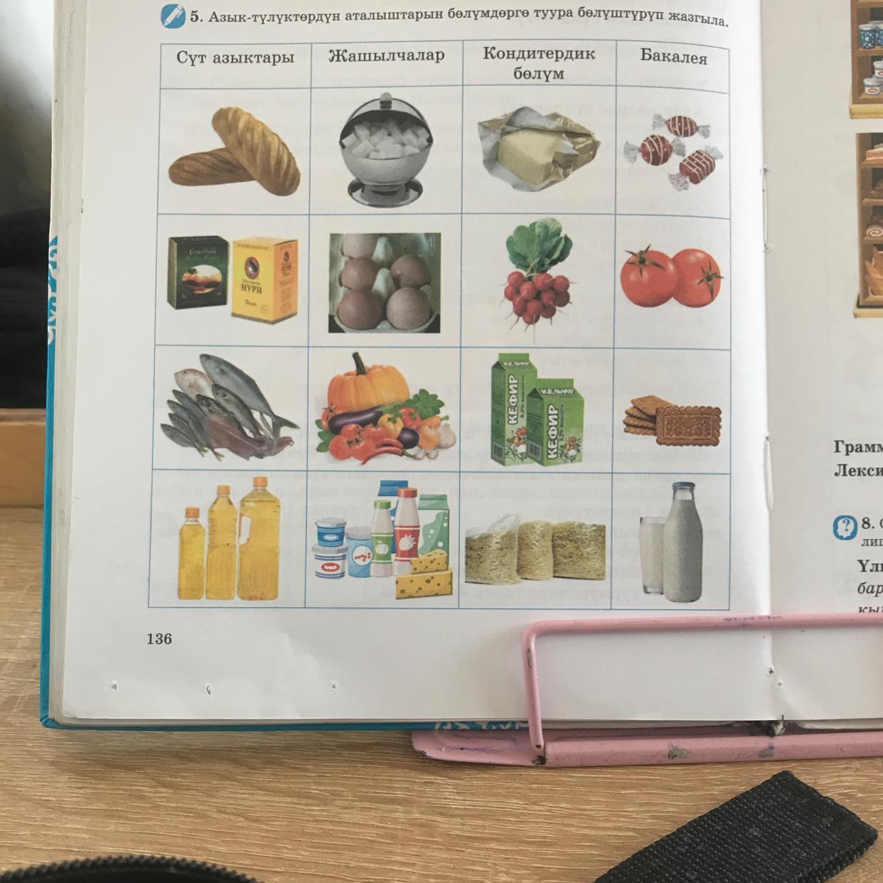 5. Азык-түлүктөрдүн аталыштарын бөлүмдөргө туура бөлүштүрүп жазгыла.