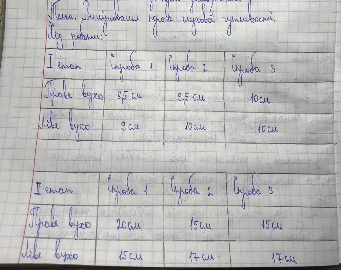 Даю 100 баллов!!!Помогите пж написать висновок : порівняйте результати і поясніть чому є розбіжності у відстанях, як змінювалися відстані? Що відбувалося із слуховими рецепторами?