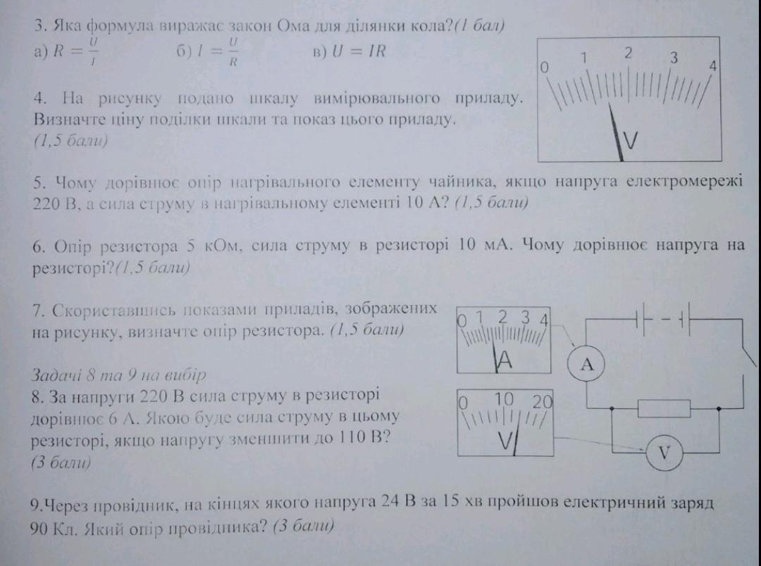 3. Яка формула виражас закон Ома для ділянки кола?(1 бал) a) R = " B) U = IR U 6) 1 = " R 4. На рисунку подано шкалу вимірювального приладу. Визначте ціну поділки шкали та показ цього приладу. (1,5 бали) 7. Скориставшись показами приладів, зображених на рисунку, визначте опір резистора. (1,5 бали) 0 Задачi 8 та 9 на вибір 8. За напруги 220 В сила струму в резисторi дорівнюс 6 А. Якою буде сила струму в цьому резисторi, якщо напругу зменшити до 110 В? (3 бали) 5. Чому дорівнюс опір нагрівального елементу чайника, якщо напруга електромережі 220 В, а сила струму в нагрівальному елементі 10 А? (1,5 бали) 6. Опір резистора 5 кОм, сила струму в резисторi 10 мА. Чому дорівнює напруга на резисторi?(1,5 бали) 0 1 2 3 4 A 10 20 V О 2 3 А 4 V 9.Через провідник, на кінцях якого напруга 24 В за 15 хв пройшов електричний заряд 90 Кл. Який опір провідника? (3 бали)