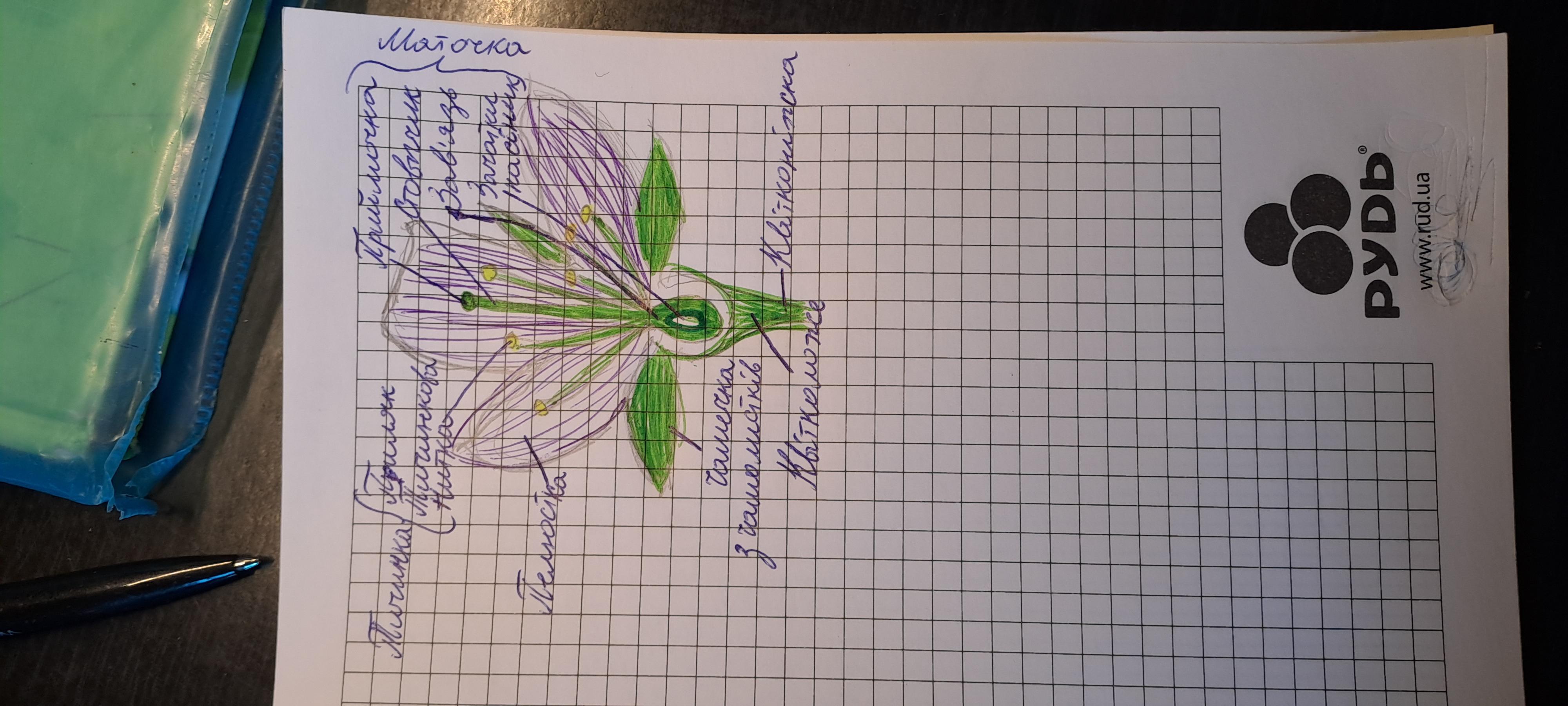 У середині квітки містяться репродуктивні частини квітки: маточка татичинки. Намалюйте та підпишіть елементи будови.