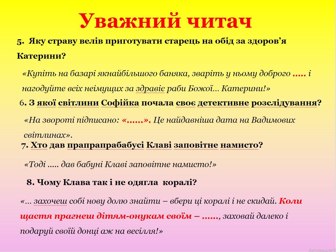 8. Клава ніколи не одягала намиста, тому що пожертвувала власним щастям заради щастя своїх дітей і онуків. "І ще пам'ятай: захочеш собі нову долю знайти – вбери ці коралі і не скидай. Коли щастя прагнеш дітям-онукам своїм – убирати не здумай, заховай далеко й подаруй своїй доньці аж на весілля! Ось чому прапрабабуня намиста ніколи не вдягала. Тому ні щастя не мала, ні віку довгого! Заради нас пожертвувала!"