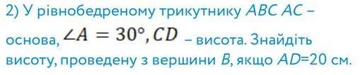 У рівнобедреному трикутнику АВС АС-основа. Кут А=30 градусів. CD-висота. Знайдіть висоту, проведену з вершини В, якщо AD=20